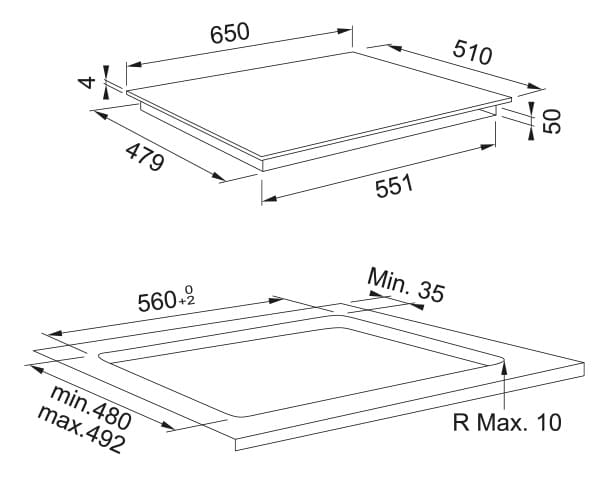 - Размеры выреза для монтажа вровень со столешницей (ШхГ): 653x513 мм, R6.5 мм.&