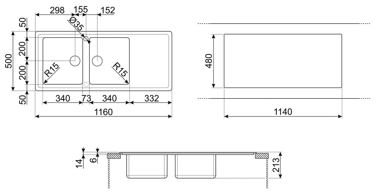 - Размеры мойки: 1160x500 мм.&