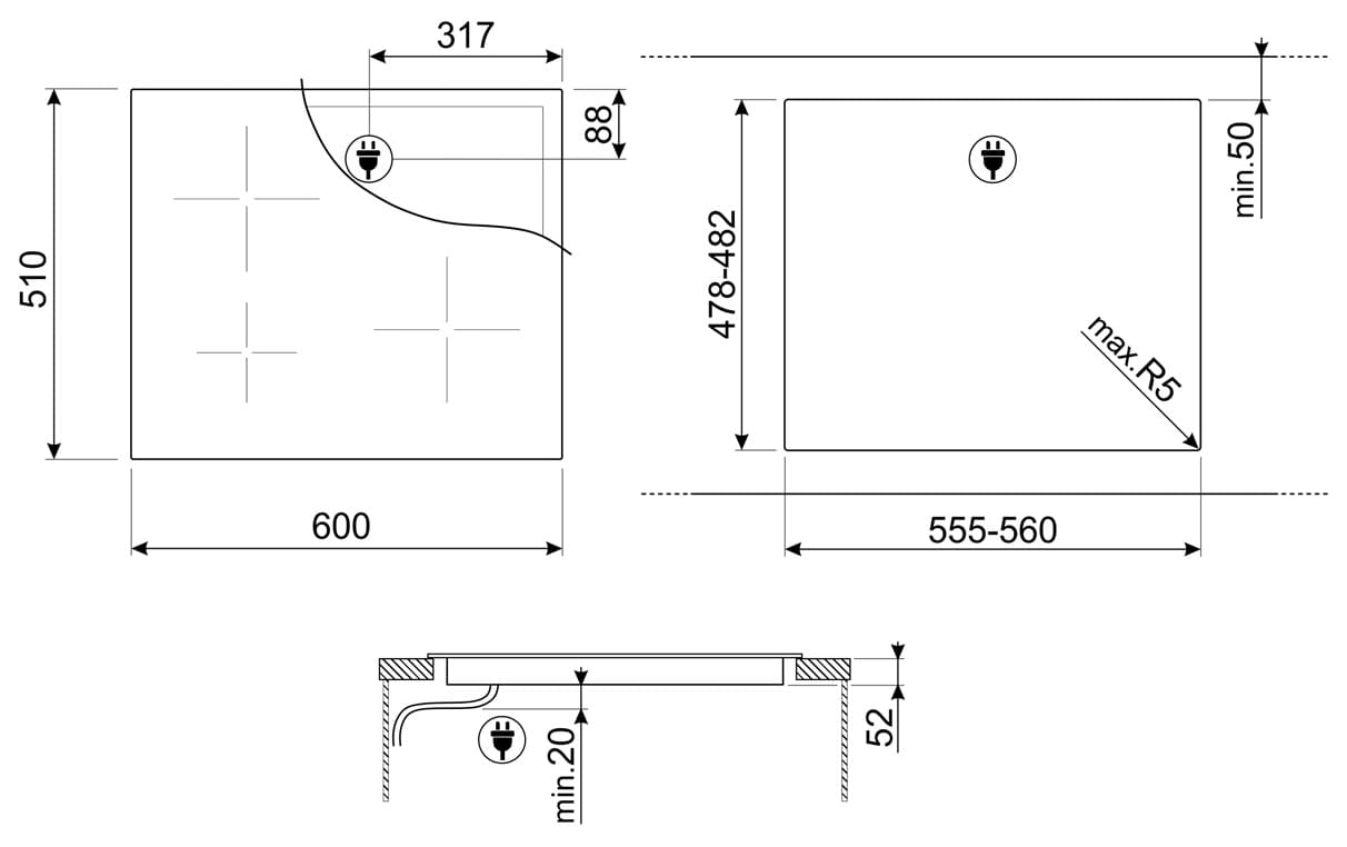 - Размеры выреза для монтажа (ШхГ): 555-560х478-482 мм.&