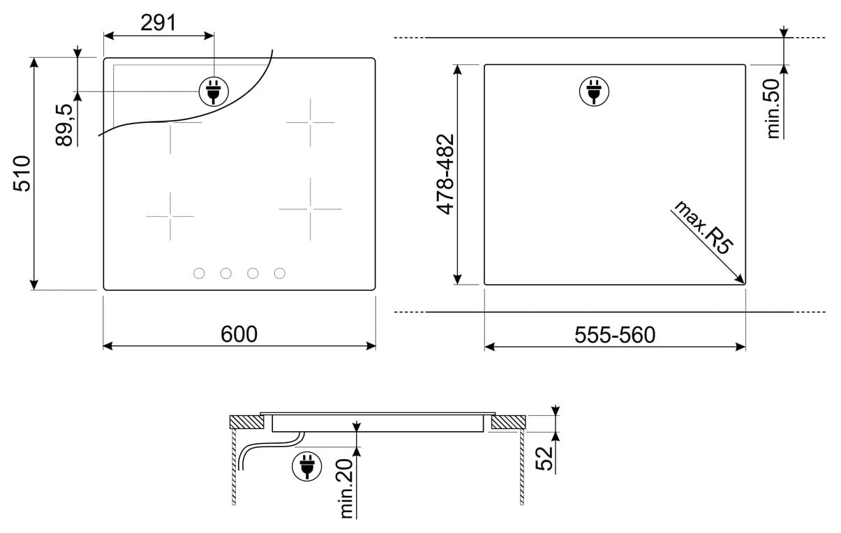 - Размеры выреза для монтажа (ШхГ): 555-560х478-482 мм.&