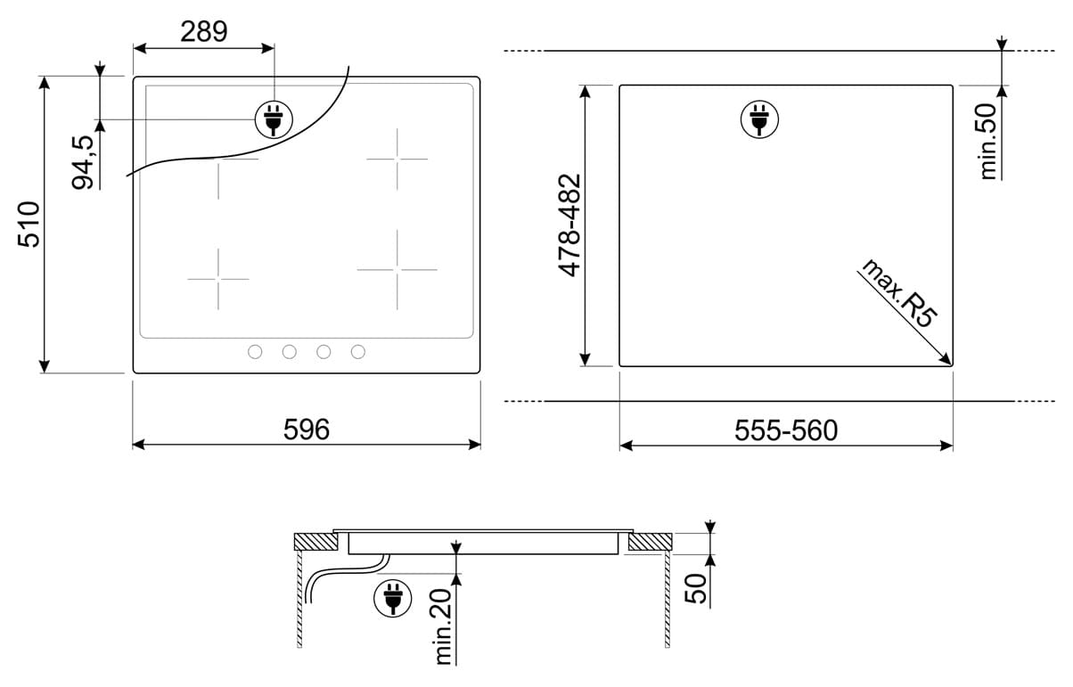 - Размеры выреза для монтажа (ШхГ): 555-560х478-482 мм.&