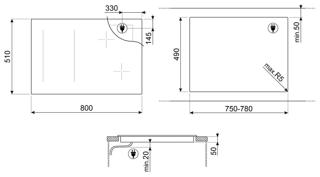 - Размеры выреза для монтажа (ШхГ): 750-780х490 мм.&