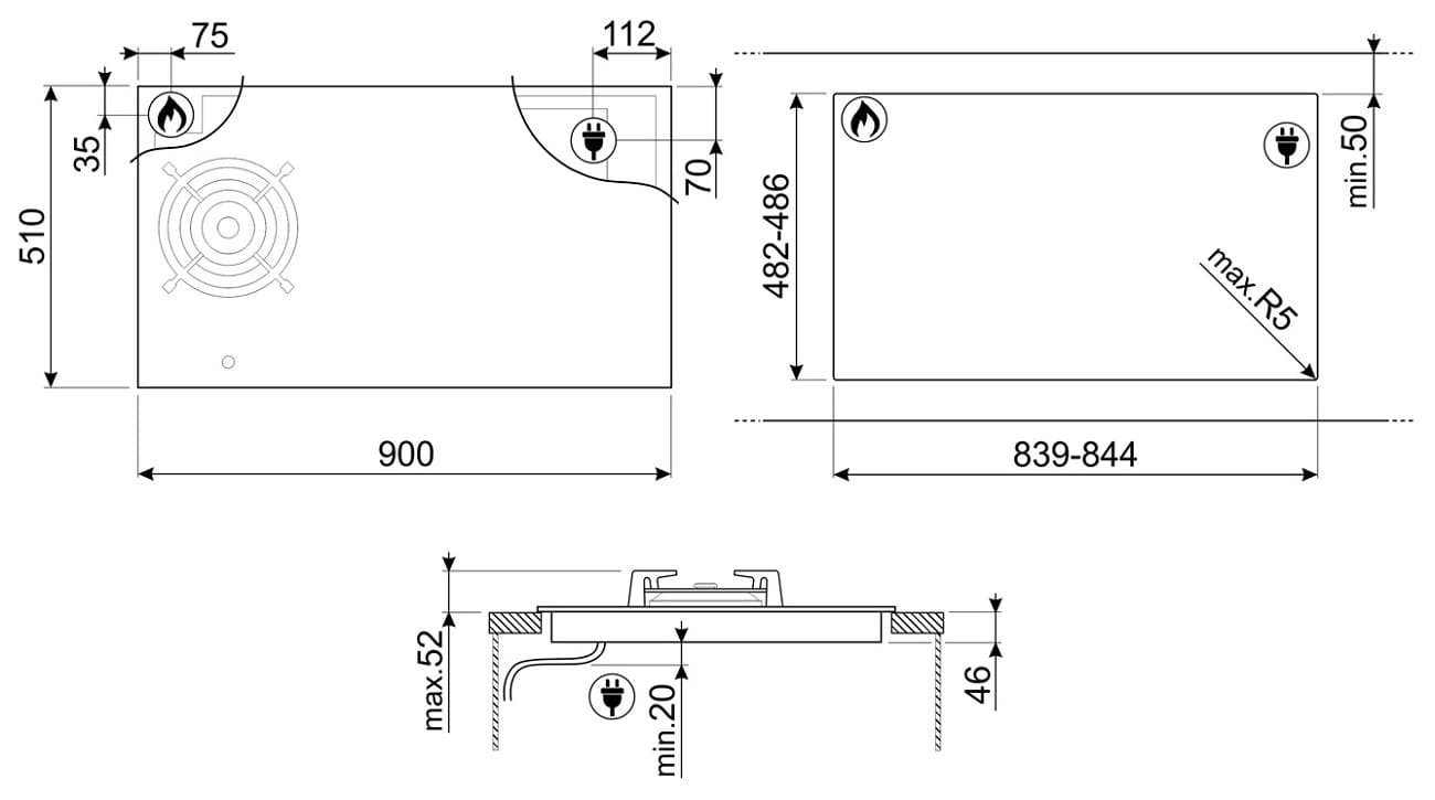 - Размеры выреза для монтажа (ШхГ): 844-848х482-486 мм.&