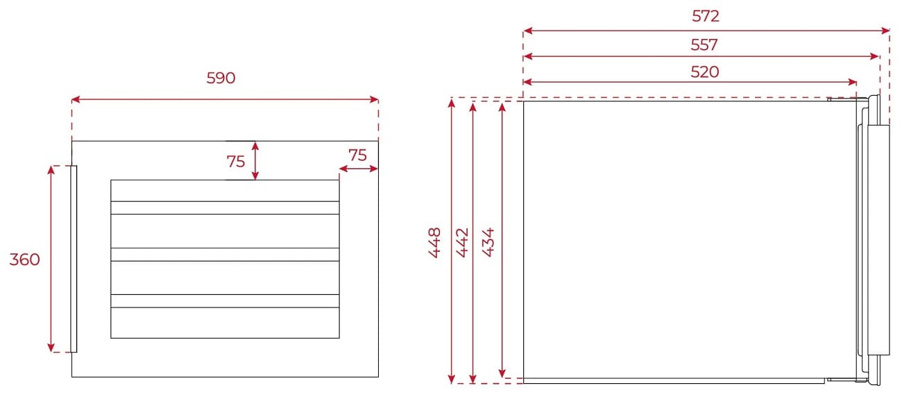 - Размеры прибора (ШхВхГ): 590х455х557 мм (+15 мм ручка).&