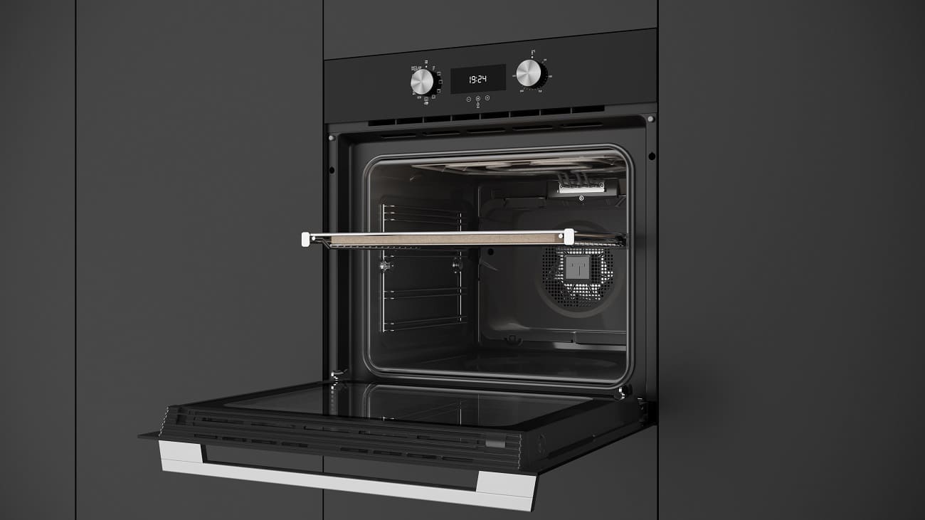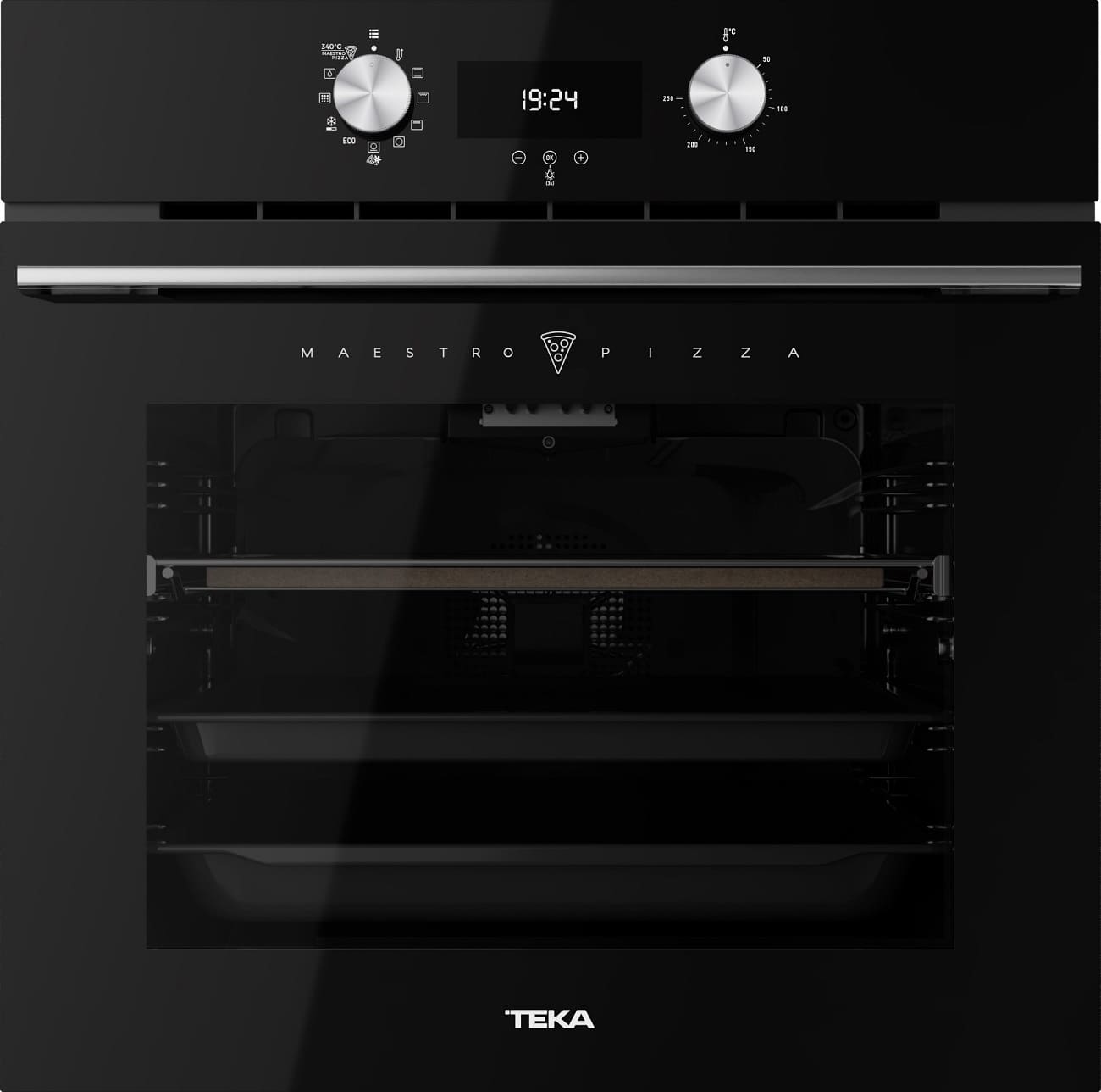 Как готовить на режиме MaestroPizza: установите решётку на телескопические направляющие, установите камень для пиццы на решётку, извлеките противни, закройте дверцу.