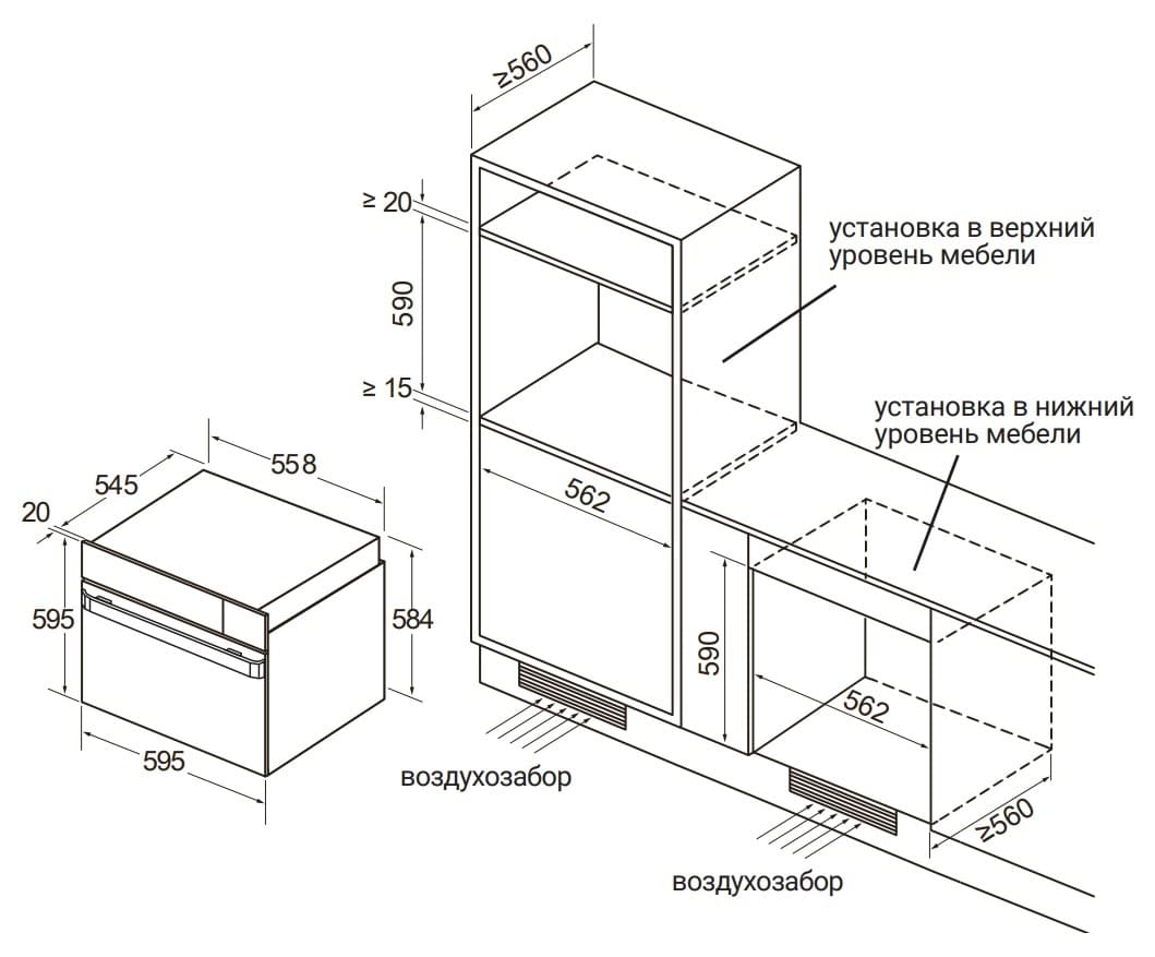 - Размеры для встраивания (ШхВхГ): 560х595х550 мм.
