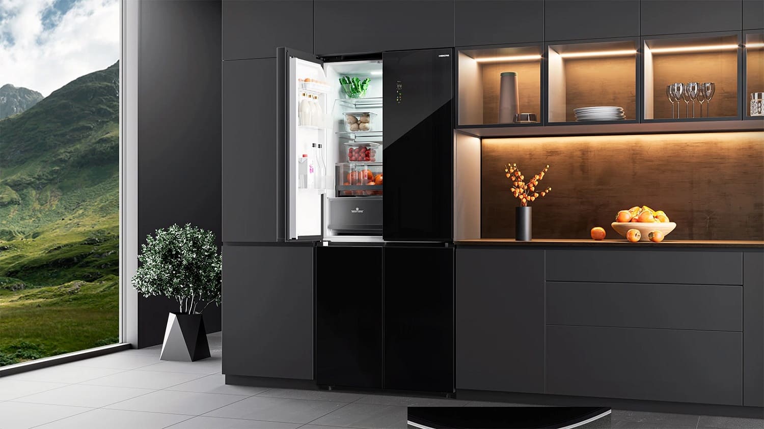 - Индивидуальная зона охлаждения (ящик выдвижной) с контролем влажности Care+ Space: -1,5ºC (морепродукты), +2ºC (мясо), +4ºC (детское питание, фрукты).