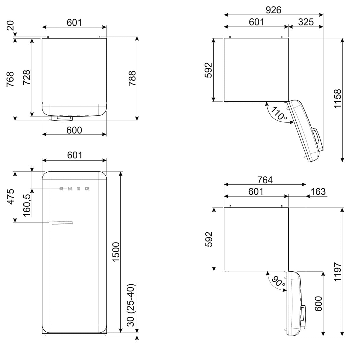 - Размеры прибора (ШxВxГ): 601х1530x728 мм.