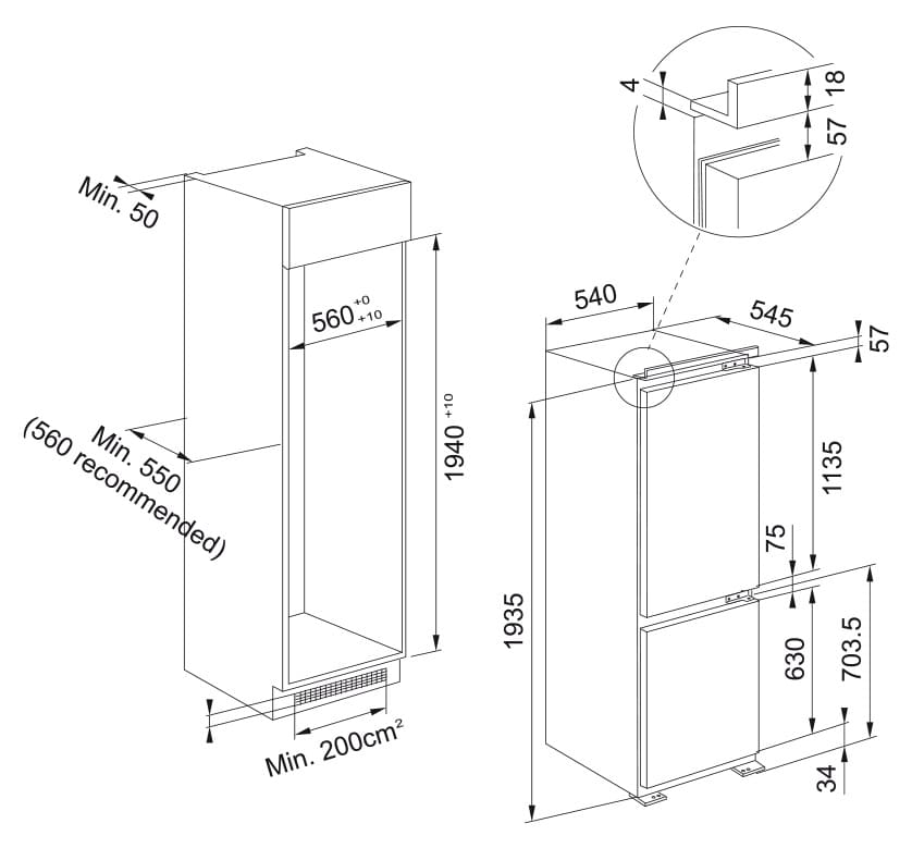 - Размеры для встраивания (ШхВхГ): 540x1935x545 мм.