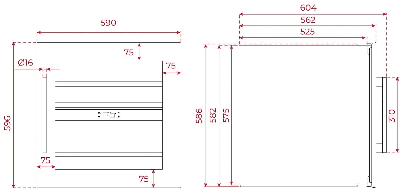 - Размеры прибора (ШхВхГ): 590х596х562 мм (+42 мм ручка).