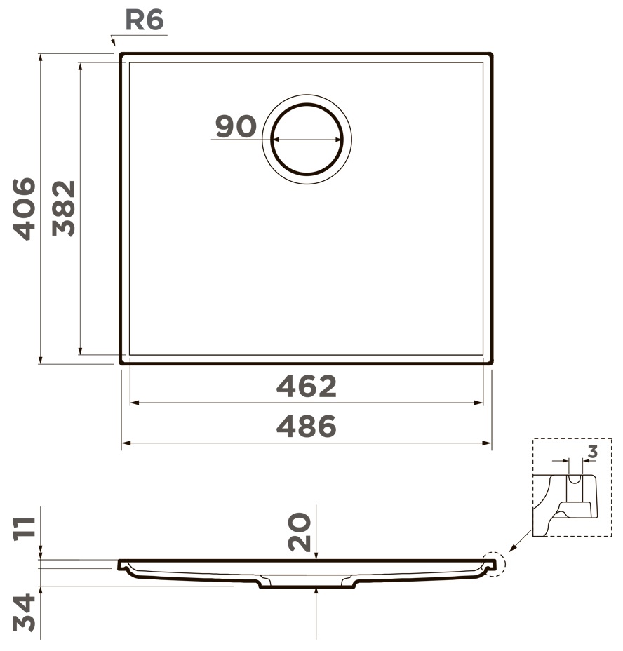 - Размеры мойки: 486х406х34 мм.