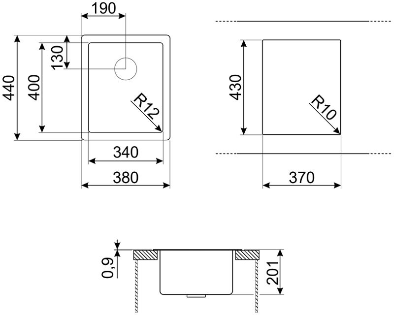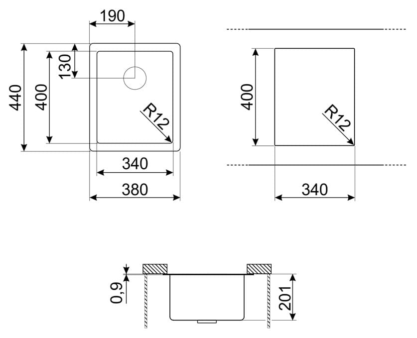 - Размеры выреза для монтажа под столешницу: 340х400 мм.