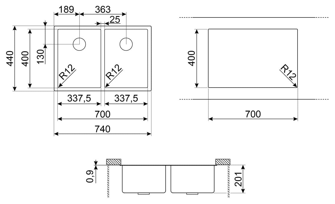 - Размеры выреза для монтажа под столешницу: 700х400 мм.