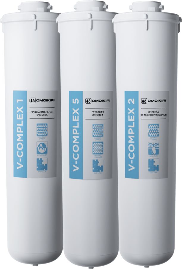 - V-Complex 2. Микрофильтрация и удаление бактерий. Сверхплотный карбонблок с порошкообразным углем и ионами серебра в нити Vivalon и мембраной NanoTube. Тонкость очистки - 0,1 мкм.