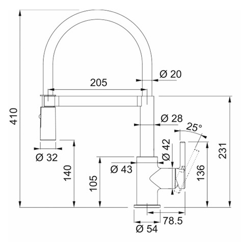 - Смеситель с поворотным изливом и гибким шлангом с функцией душа.