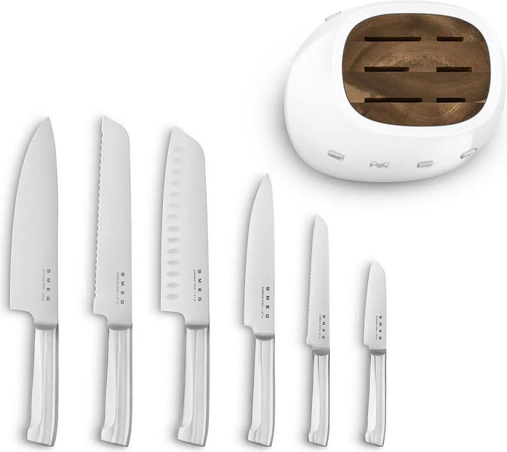 - В комплект входят 6 эксклюзивных ножей: нож для очистки овощей, универсальный нож, нож для мяса, нож Сантоку, нож для хлеба и поварской нож.