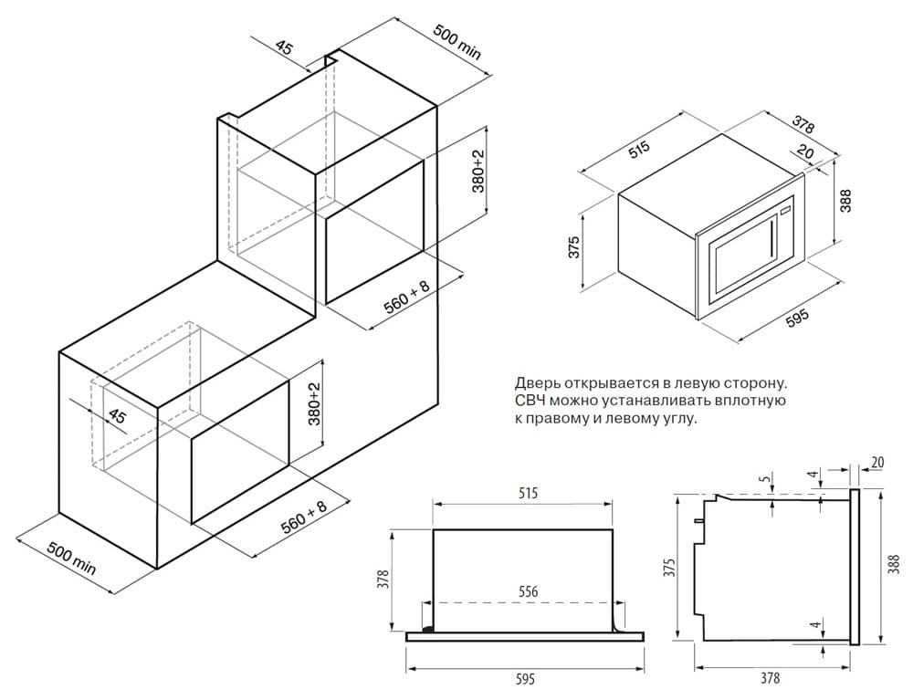 - Размеры встраиваемой части (ШхВхГ): 556х375х378 мм.