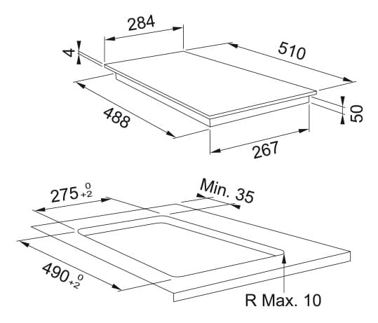 - Размеры выреза для монтажа вровень со столешницей (ШхГ): 287x513 мм, R6.5 мм.