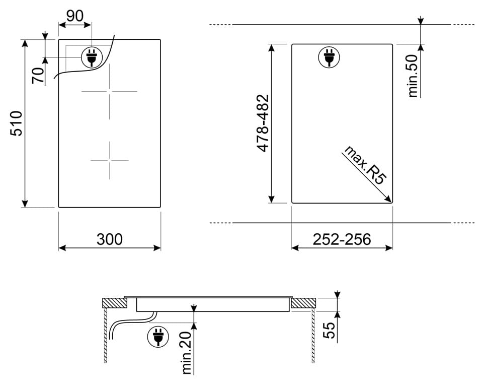 - Размеры выреза для монтажа (ШхГ): 252-256х478-482 мм.
