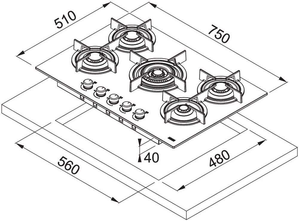 - Размеры выреза для монтажа (ШхГ): 560х480 мм.