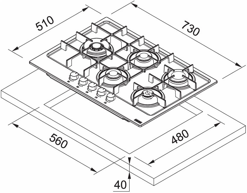 - Размеры выреза для монтажа (ШхГ): 560х480 мм.