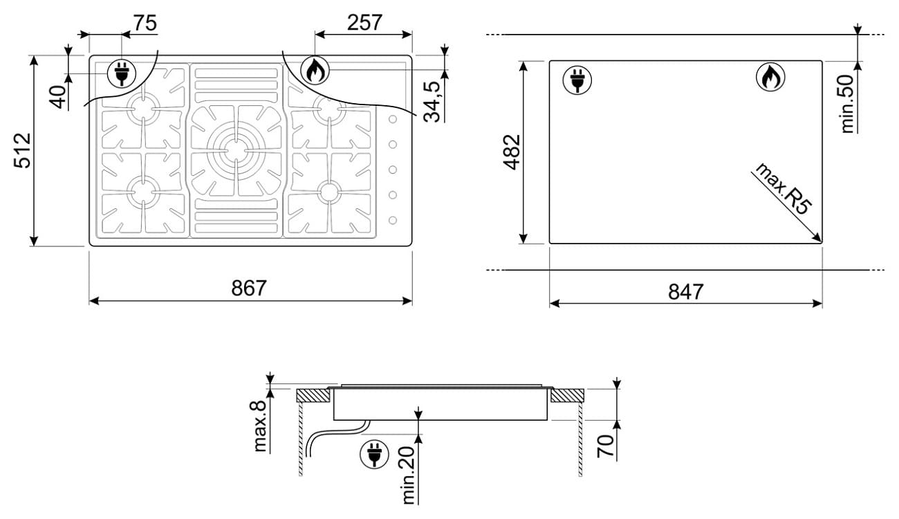 - Размеры выреза для монтажа (ШхГ): 847х482 мм.
