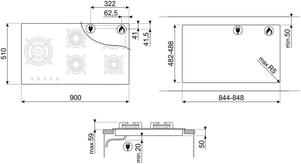 - Размеры выреза для монтажа (ШхГ): 844-848х482-486 мм.