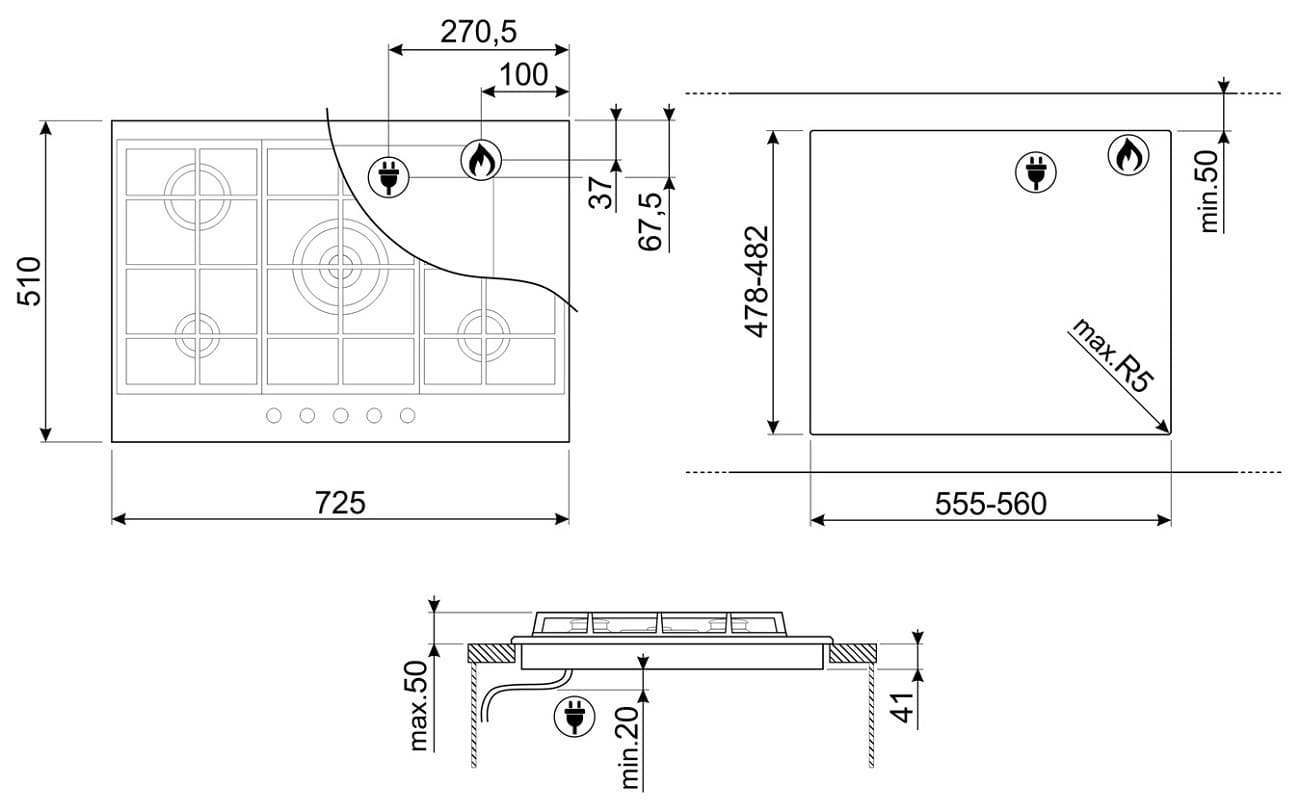 - Размеры выреза для монтажа (ШхГ): 555-560х478-482 мм.