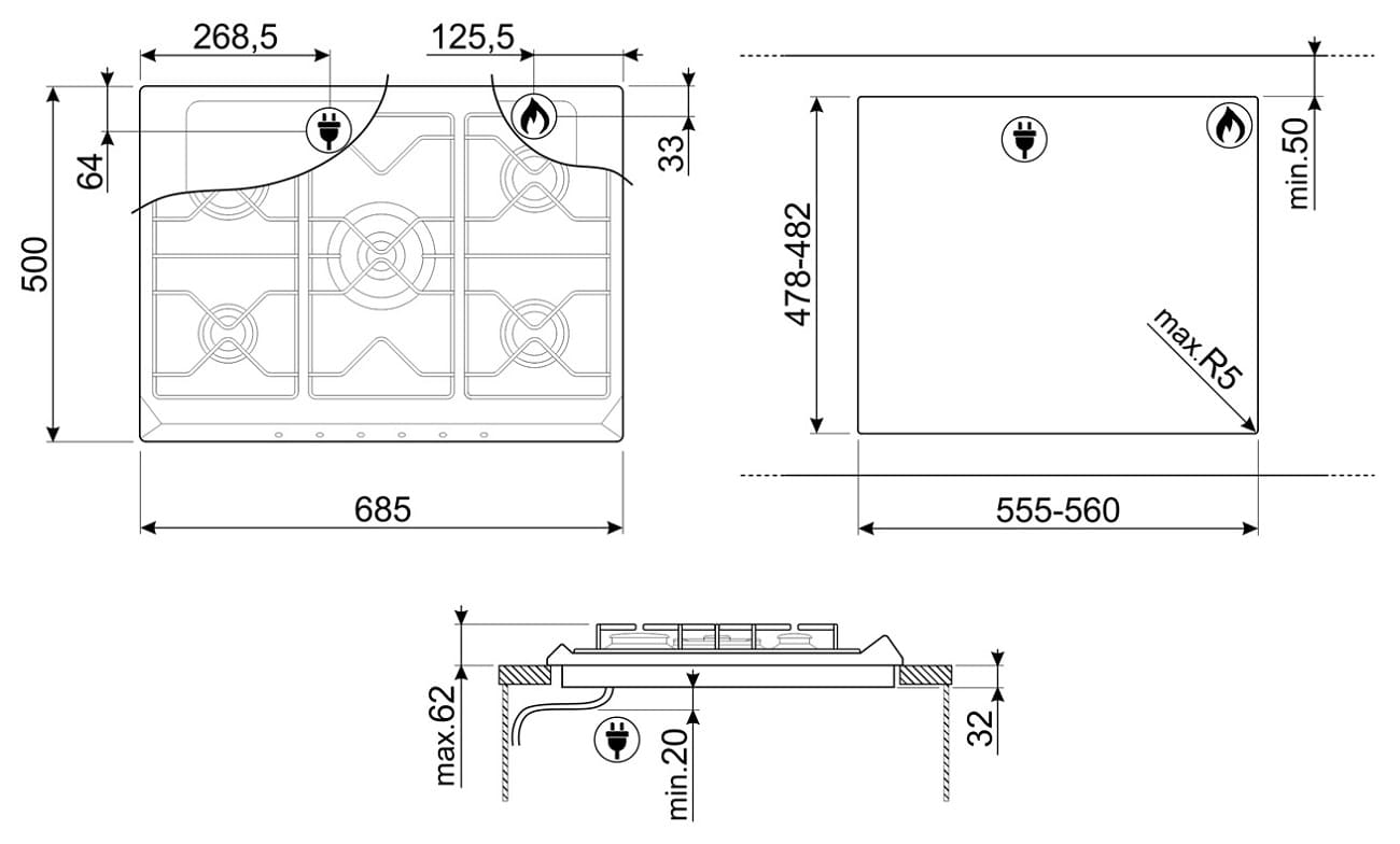 - Размеры выреза для монтажа (ШхГ): 555-560х478-482 мм.