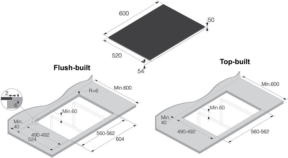 - Устанавливается сверху или вровень со столешницей без рамки.