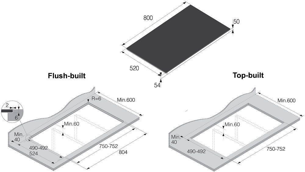 - Устанавливается сверху или вровень со столешницей без рамки.