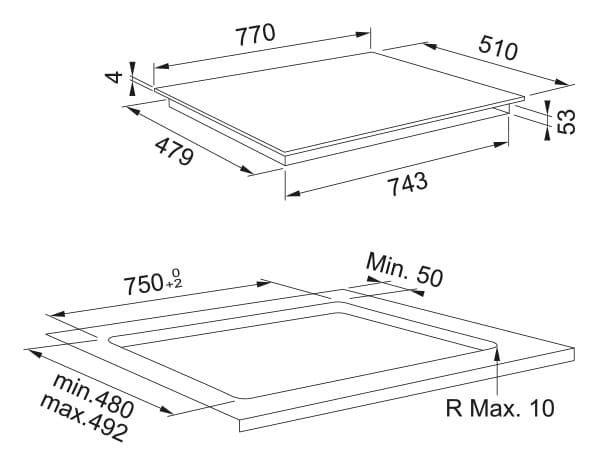 - Размеры выреза для монтажа сверху (ШхГ): 750x492 мм.