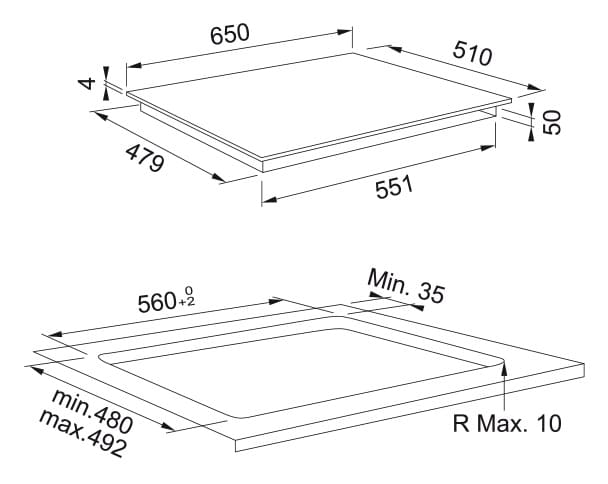 - Размеры выреза для монтажа сверху (ШхГ): 560x492 мм.