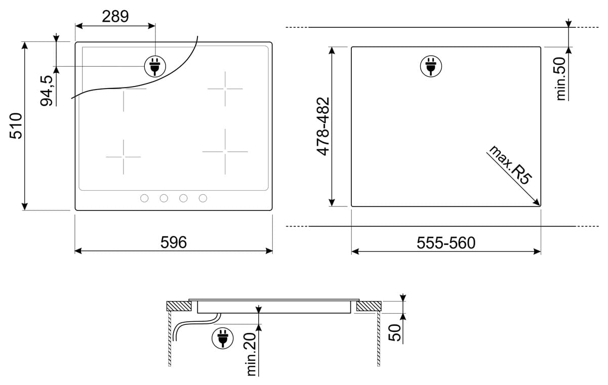 - Размеры выреза для монтажа (ШхГ): 555-560х478-482 мм.